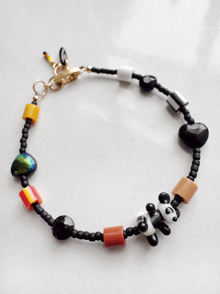 care : *** the center critter bead is made of lamp-worked GLASS. it can absolutely break if hit hard enough. this is a special bracelet you wear for the day (after applying cosmetics, clothing) and take off when you sleep / shower / swim / sweat *** other than that, ok to get wet, rinse and dry thoroughly . avoid excessive exposure to moisture, cosmetics, chemicals, rough wear
