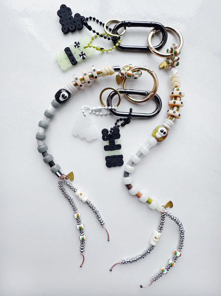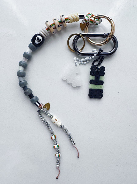 made with and assortment of vintage Czech glass beads, African trade beads, locally handmade lamp work skull bead, wood, silver plated brass, brass wood, melty beads and bone beads.