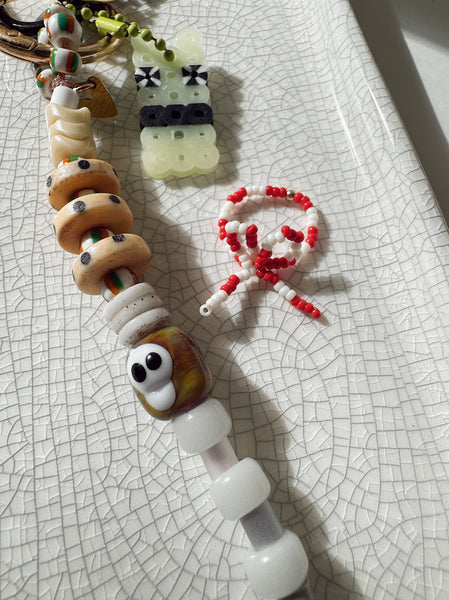 made with and assortment of vintage Czech glass beads, African trade beads, locally handmade lamp work skull bead, wood, silver plated brass, brass wood, melty beads and bone beads.